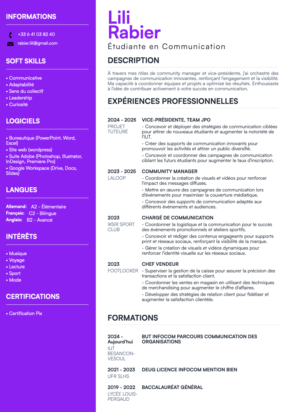 Passionnée par la communication et le digital, je suis actuellement en BUT Information-Communication, parcours Communication des Organisations à Besançon. Mon parcours universitaire m’a permis d’explorer différents aspects de la communication et d’acquérir une vision stratégique et opérationnelle du secteur.